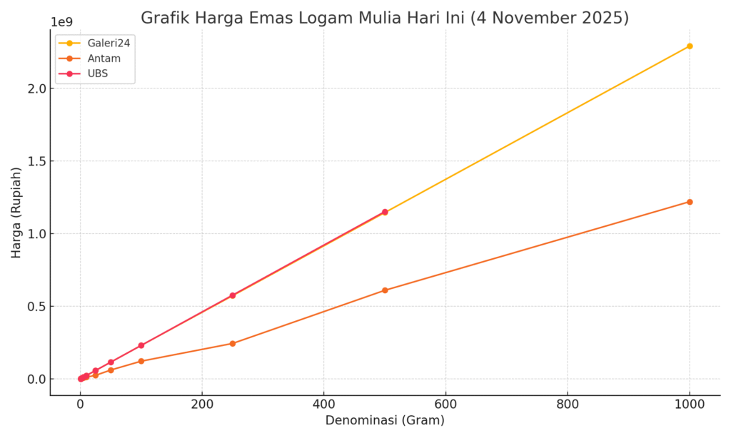 Berikut visualisasi grafik harga emas logam mulia hari ini (4 November 2025) untuk ketiga merek besar: Galeri24, Antam, dan UBS. Grafik ini menunjukkan pergerakan harga berdasarkan ukuran berat emas.